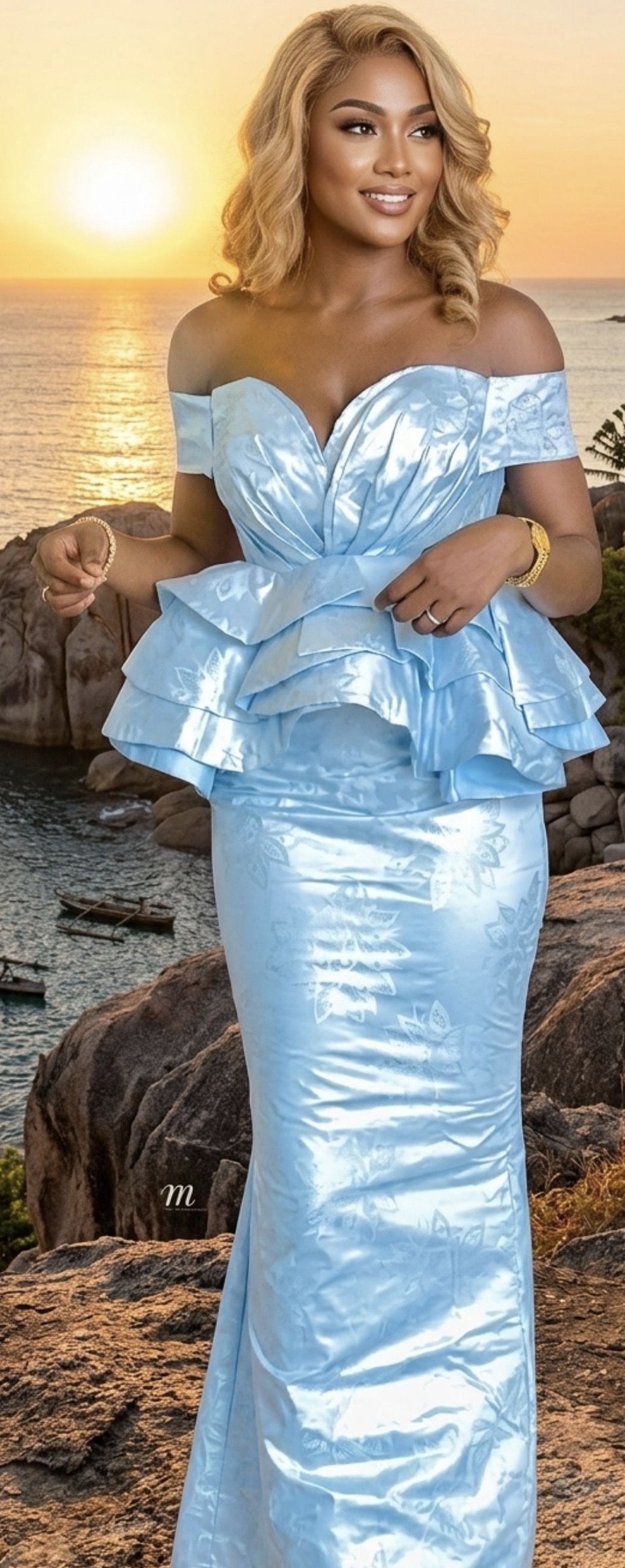 • Design : Ensemble bustier à volants superposés et jupe sirène.