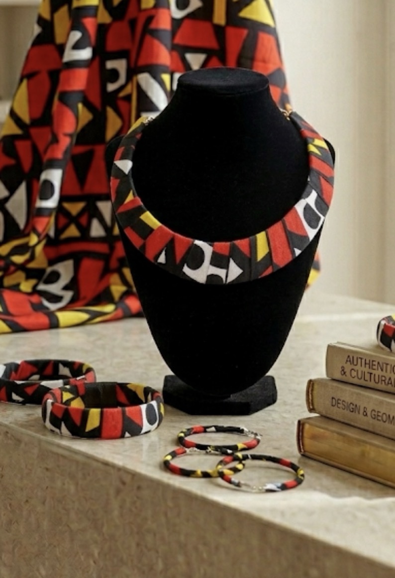 Une parure artisanale complète en véritable Wax Hollandais. L’alliance parfaite entre tradition culturelle et design moderne pour illuminer votre tenue en un clin d’œil.